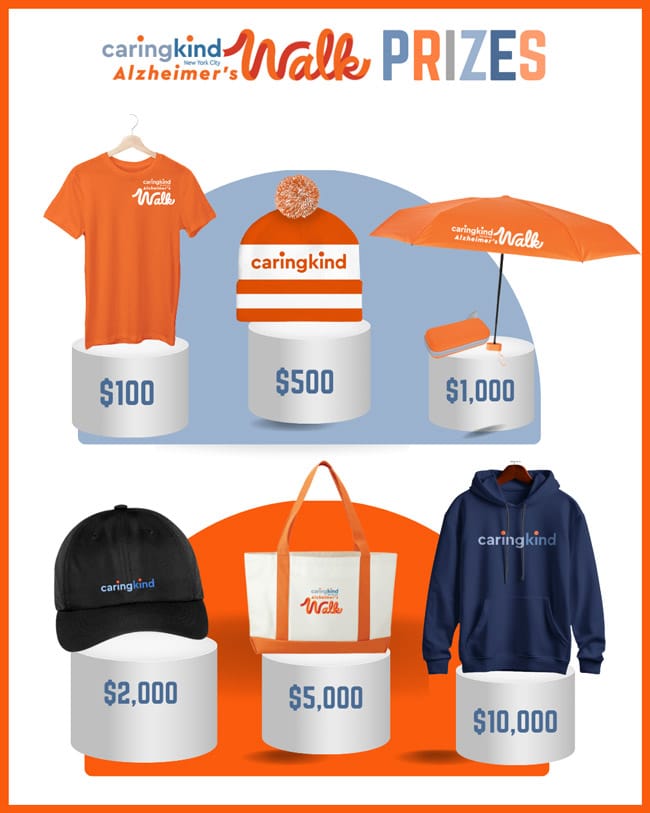 Thank you for walking and fundraising with CaringKind! You can pick your fundraising prizes on the day of the Walk.